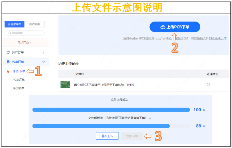 2)上传PCB下单压缩包文件(支持AD、PADS格式的原PCB文件,及RS-274X的GERBER文件)