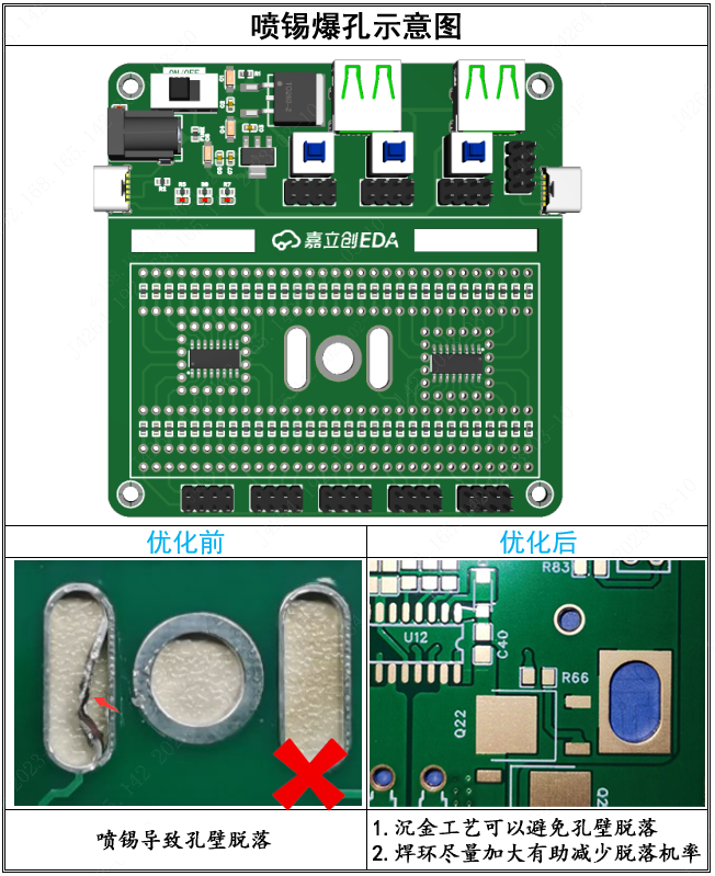 喷锡又叫热风整平(HSAL),其加工方式是把板通过导轨垂直向下浸到液态的高温锡液中,然后再向上提起,用强热风吹平槽孔板面的锡液,对于过大的喷锡孔(圆孔或椭圆形孔),孔壁的铜面有时会与基材发生脱落,从而导致孔壁铜面部分或全部脱落(点此查看原因),引起断路。