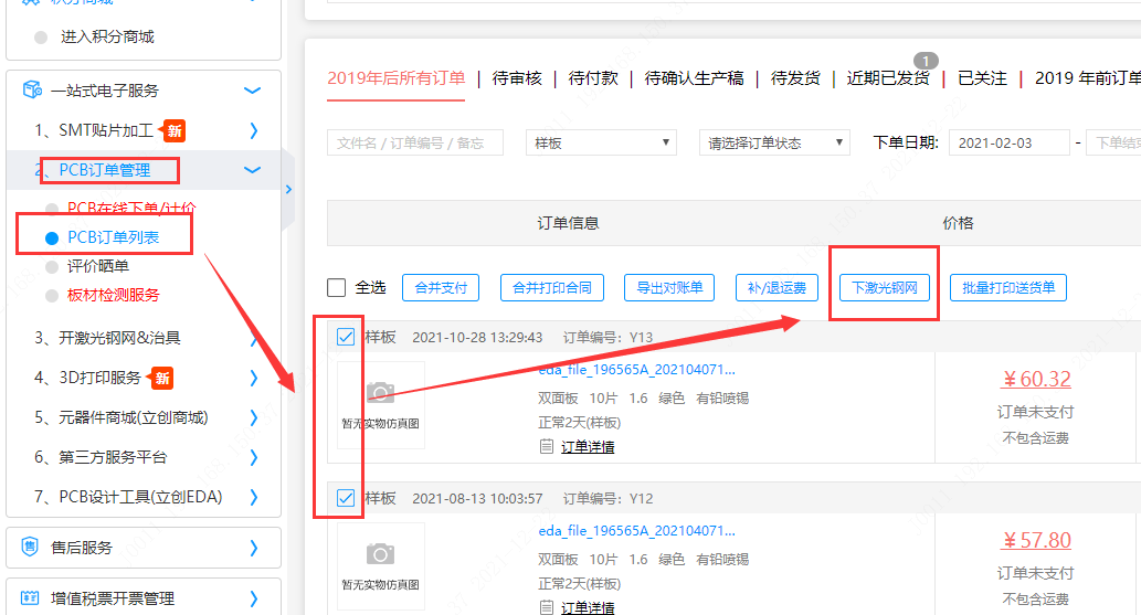 2).若PCB是在 做的,同类型订单请在订单确认里面选择PCB订单下钢网(如图)