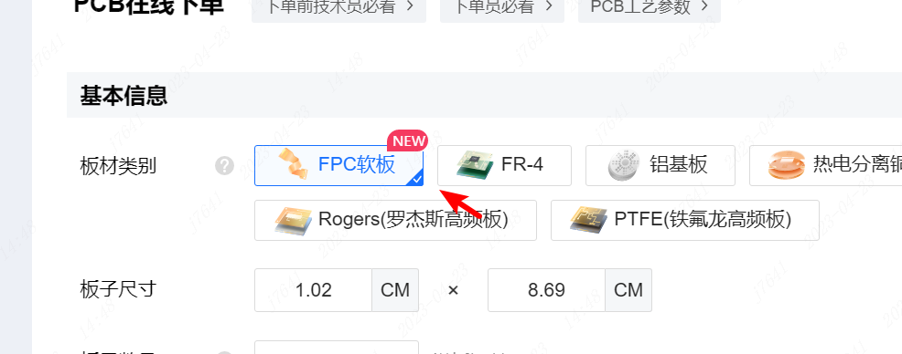 2、下单页面,板材类型选择FPC软板