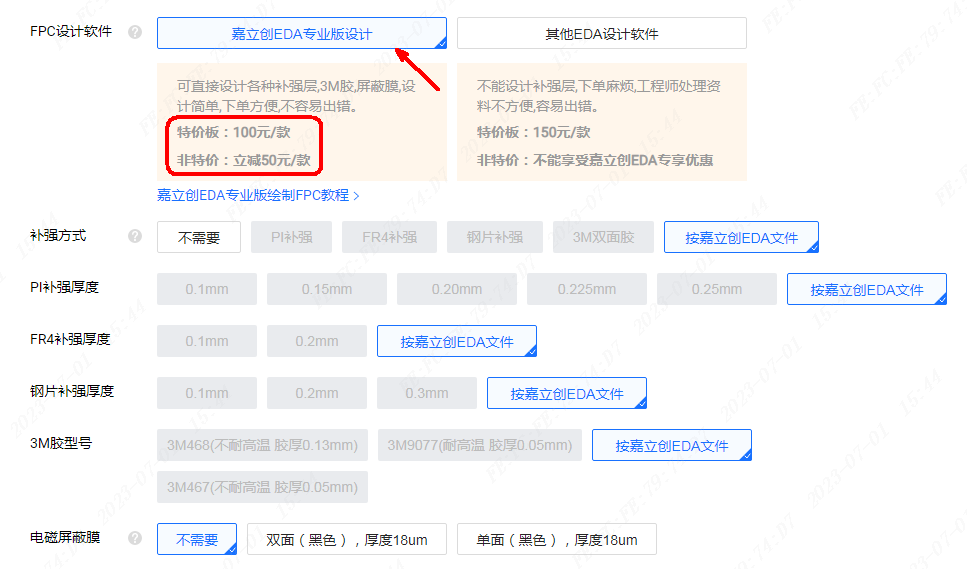 3、FPC设计软件选择“ EDA专业版设计”,不用填写补强方式,还可享受 EDA设计优惠