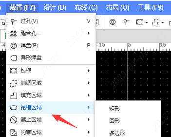 - 在PCB页面的顶部菜单中点击放置菜单,即可找到FPC补强板选项