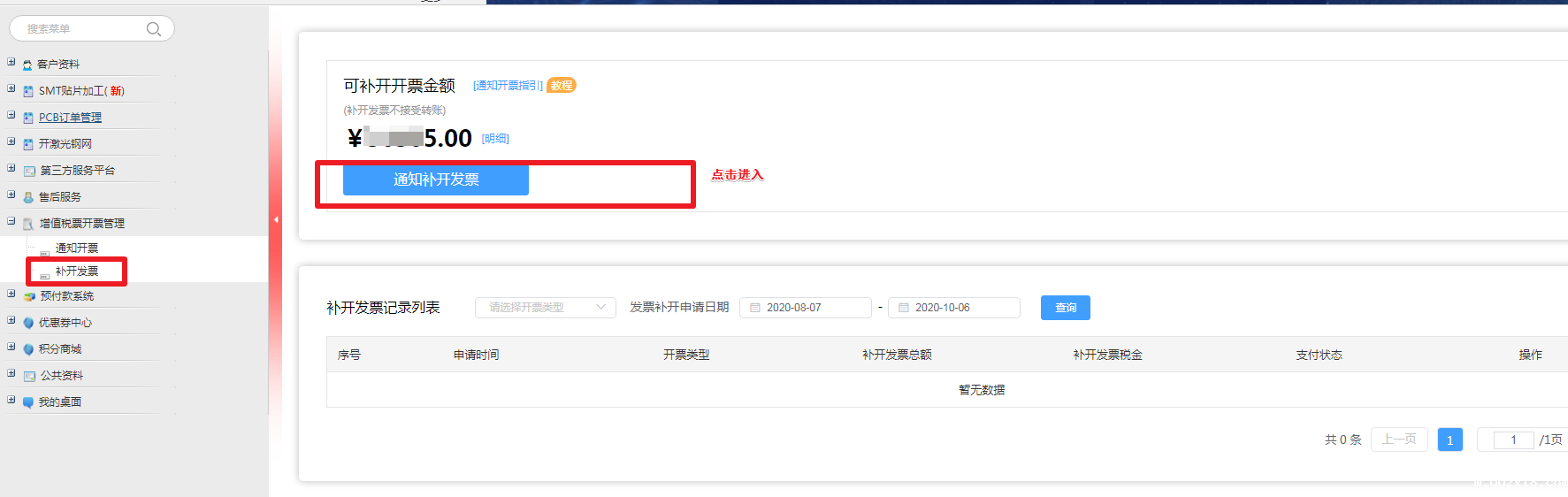 您好,进入系统后,在左侧列表开票中心查看,需要协助的可以点击下单主界面左上方“专属客服”图标-“PCB/钢网/SMT业务咨询”,找到您的服务专员联系处理。谢谢!