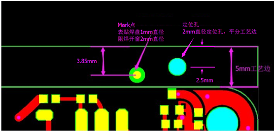 结合我司SMT的加工工艺,我们建议工艺边按5MM来设计,定位孔大小按2MM,光点大小按1MM,距板边3.85MM,具体见图示: