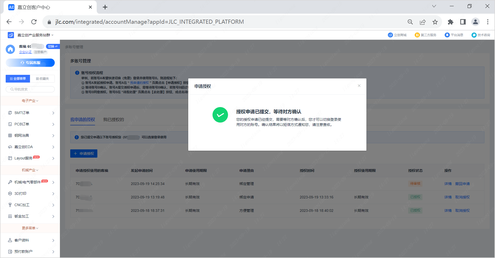 登录到客户中心,在界面左上角位置,客编后面 “ 切换 ” 按钮, 鼠标移到 “ 切换 ” 按钮上,会以小卡片的形式显示关联的账号,若还未有授权账号,则无数据显示;
