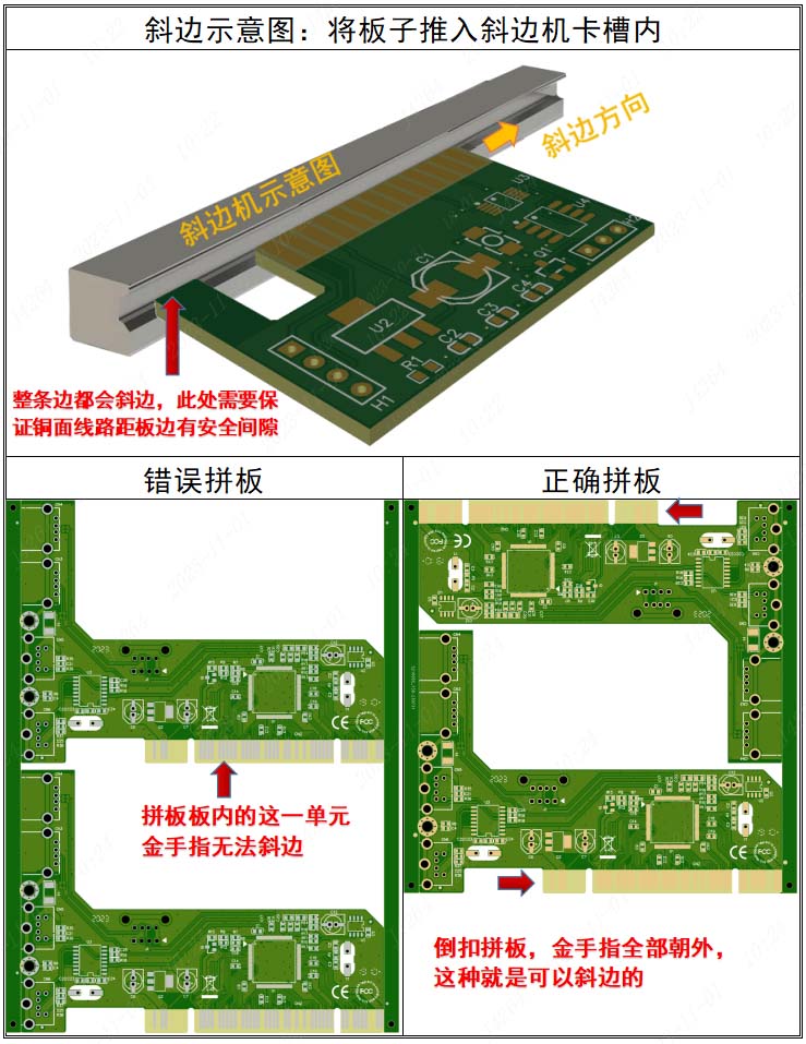在生产金手指类型板子,为了使板子便于插于卡槽中,需要把金手指对应的板边削尖一些, 生产上是把板放入机器卡槽中,从一端到另一端移动斜边