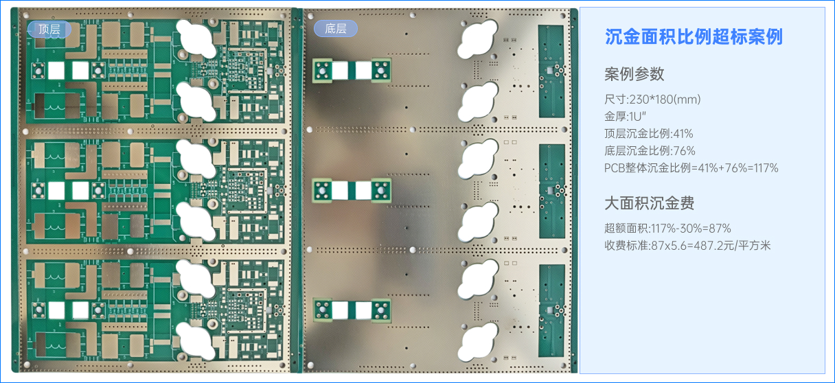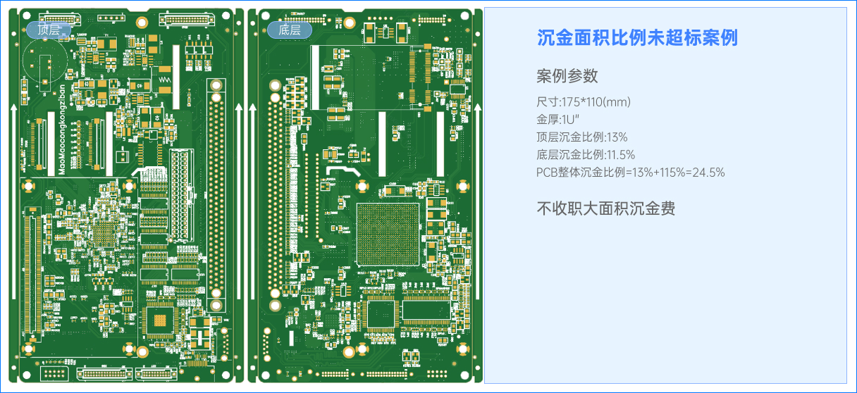 费用说明:沉金工艺包括在裸露铜面上沉积镍层和金层,随铜面裸露面积增大,沉金面积也相应增加,导致加工过程中镍角与金盐的消耗量显著提升。为保持材料成本与服务品质之间的平衡,当PCB顶底层两面沉金面积合计占比超 30% 时,将在常规收费基础上加收金价成本费(注:随金价波动动态调整),具体收费规则如表5.1所示,沉金面积比例超标和未超标案例见图5-1与图5-2。